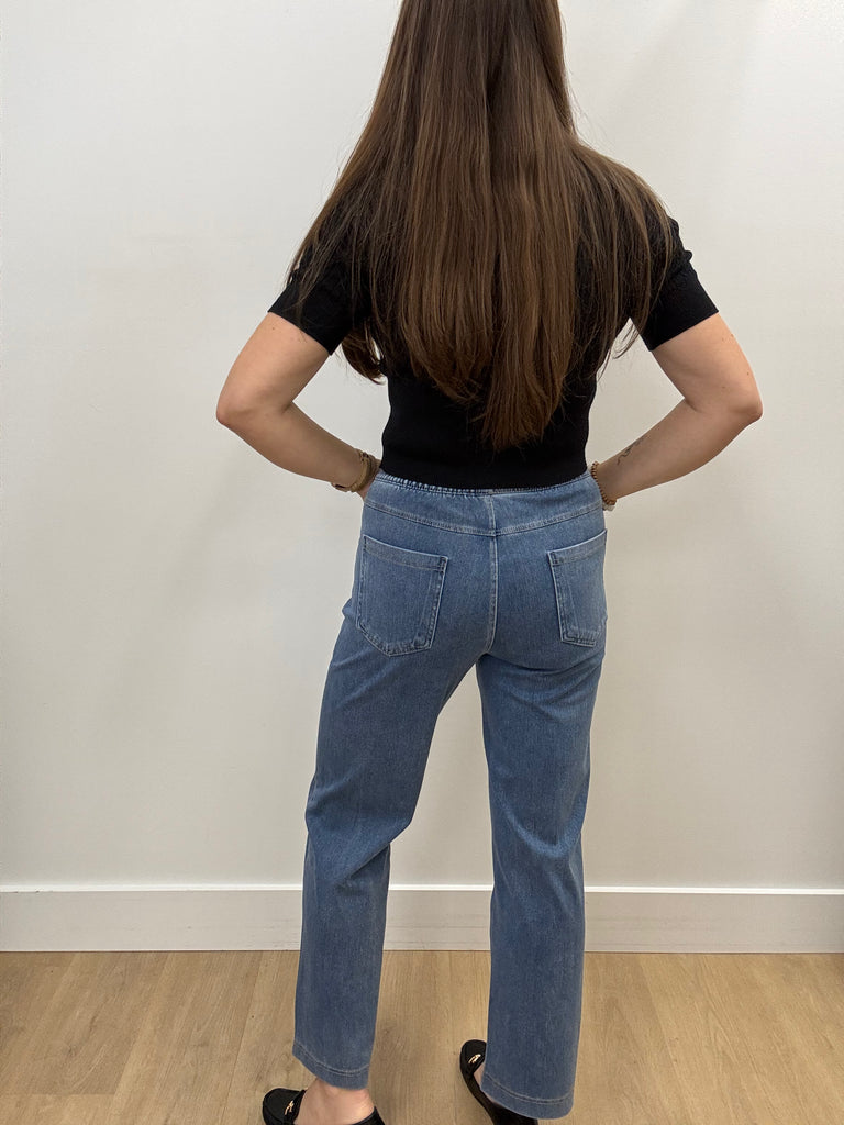 Pull on elastic waist stretch denim look jogger.